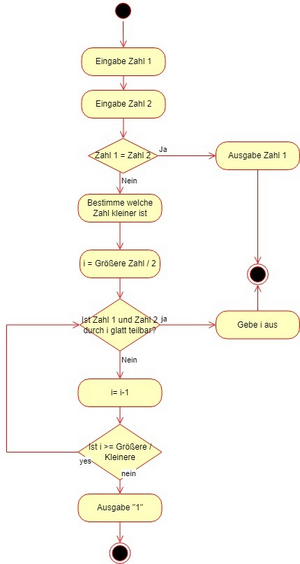 Es soll ein Algorithmus entwickelt werden, um den größten gemeinsamen Teiler (GGT) zweier ganzzahliger Werte zu ermitteln. Der GGT zweier Werte m und n ist im günstigen Fall m/2 bzw. n/2, im ungünstigen Fall 1. Hat der GGT den Wert 1, werden die beiden Zahlen als teilerfremd bezeichnet.