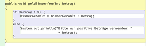 - Methodenaufrufanweisung: Führt eine Methode aus. Beispiel: System.out.println("Hallo!");