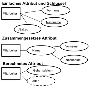 Ein Attribut beschreibt eine Eigenschaft einer Entitätsklasse und besitzt einen eindeutigen Namen. Auch ein Schlüssel ist ein Attribut. Attribute können sich aus anderen zusammensetzen oder automatisch berechnet werden (wie z.B. das Alter, das sich aus dem Geburtsdatum berechnet).