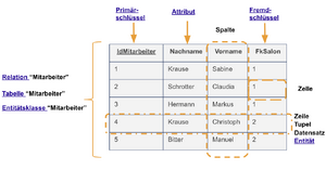 Für die Erstellung einer relationalen Datenbank kann, ausgehend von diesem Modell, eine Entitätsklasse als eine Tabelle in einer Datenbank umgesetzt werden, wobei jede Tabellenzeile (oder Datensatz, im Falle einer relationalen Datenbank Tupel genannt) einer Entität entspricht.