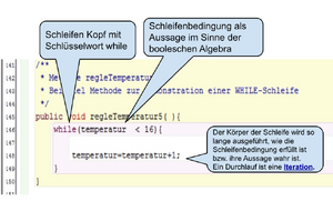 Hier wird ein Anweisungsblock wiederholt durch den „Schleifenrumpf“ ausgeführt; jede Ausführung ist eine Iteration der Schleife.
