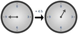 Eine bekannte Verwendung der modularen Arithmetik ist die 12-Stunden-Uhr, bei der der Tag in zwei 12-Stunden-Perioden unterteilt ist. Diese Zeitdarstellung ist vor allem in englischsprachigen Ländern üblich. Hier gilt, wenn es 9:00 Uhr ist, ist es 4 Stunden später 1:00 Uhr. In zum Beispiel Deutschland würde die spätere Zeit 9 + 4 = 13 ergeben. Dies wäre für die 12-Stunden-Uhr nicht die richtige Lösung, da die Uhrzeit alle 12 Stunden "umläuft". Da die Stundenzahl nach Erreichen von 12 von vorne beginnt, kann diese Berechnung durch Modulo 12 abgebildet werden. 12 nicht nur mit 12 selbst, sondern auch mit 0 kongruent. Oder anders formulier; die als "12:00" bezeichnete Zeit kann auch als "0:00" bezeichnet werden.
