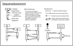 Ein Sequenzdiagramm beschreibt das Verhalten eines Systems, indem es die zeitliche Ordnung von Ereignisauftritten spezifiziert. Nicht der präzise Zeitpunkt, wann ein Ereignis auftritt, ist dabei ausschlaggebend, sondern welche Ereignisse vor und welche nach einem bestimmten Ereignisauftritt auftreten müssen (Quelle https://de.wikipedia.org/wiki/Sequenzdiagramm).