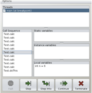 Ein Java-Programm startet immer mit der main-Methode. Hierdurch wird ein sogenannter Thread angelegt. Für diesen Thread werden alle Methodenaufrufe (siehe Call Sequence) in Form von Frames wie ein Stack verwaltet. Für jeden Methodenaufruf werden die einzelnen lokalen Variablen gespeichert.
